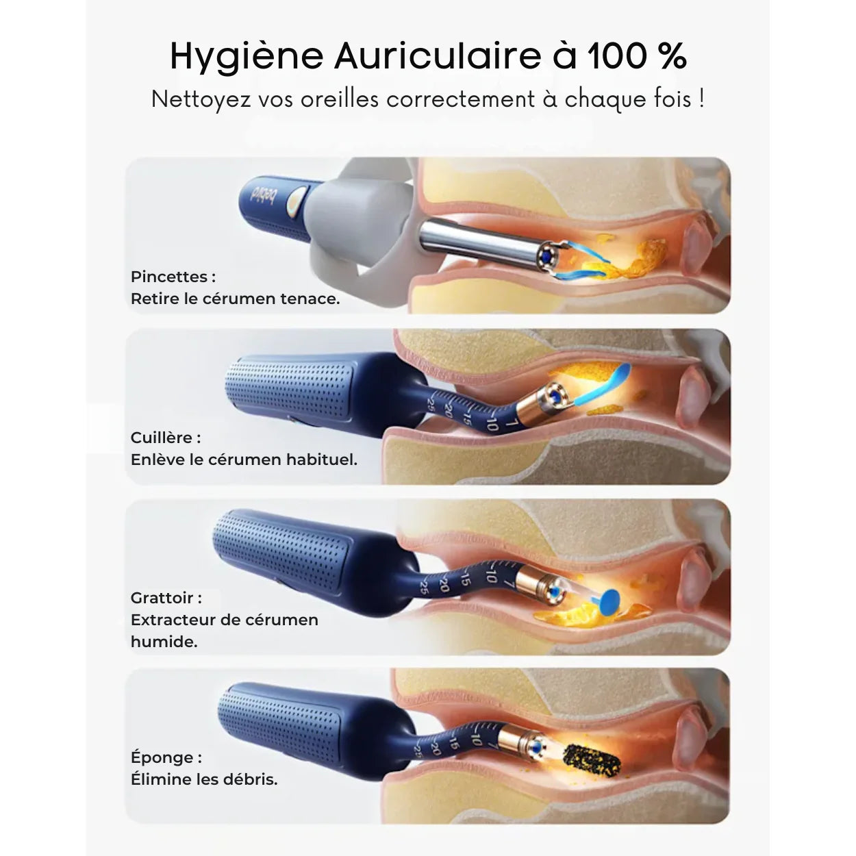 - Modes de Nettoyage : 4 modes intelligents (oreilles humides, cérumen dur, etc.)
