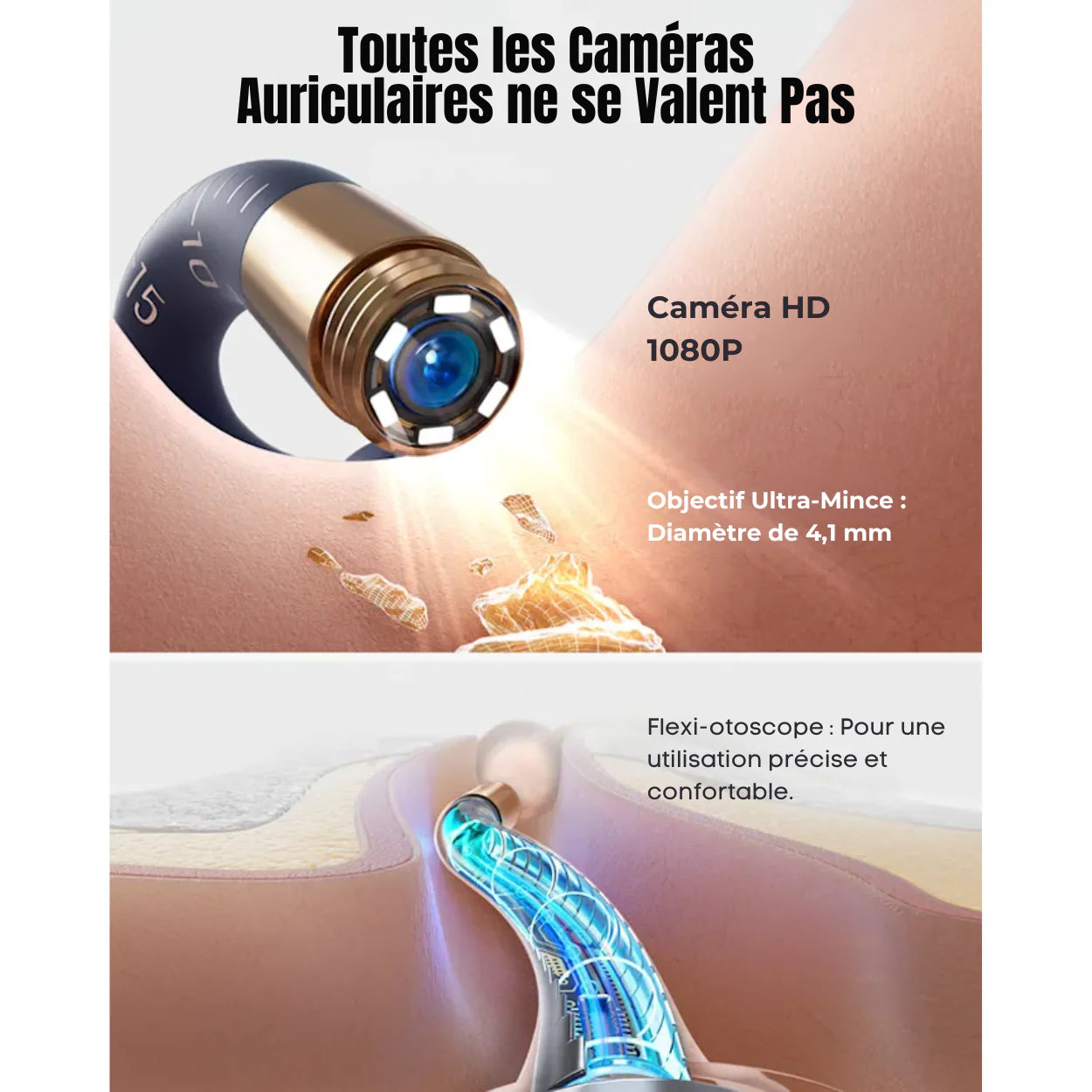 - Caméra 1080P : Pour une vue précise de l’intérieur de l’oreille et un contrôle maximal lors du nettoyage.